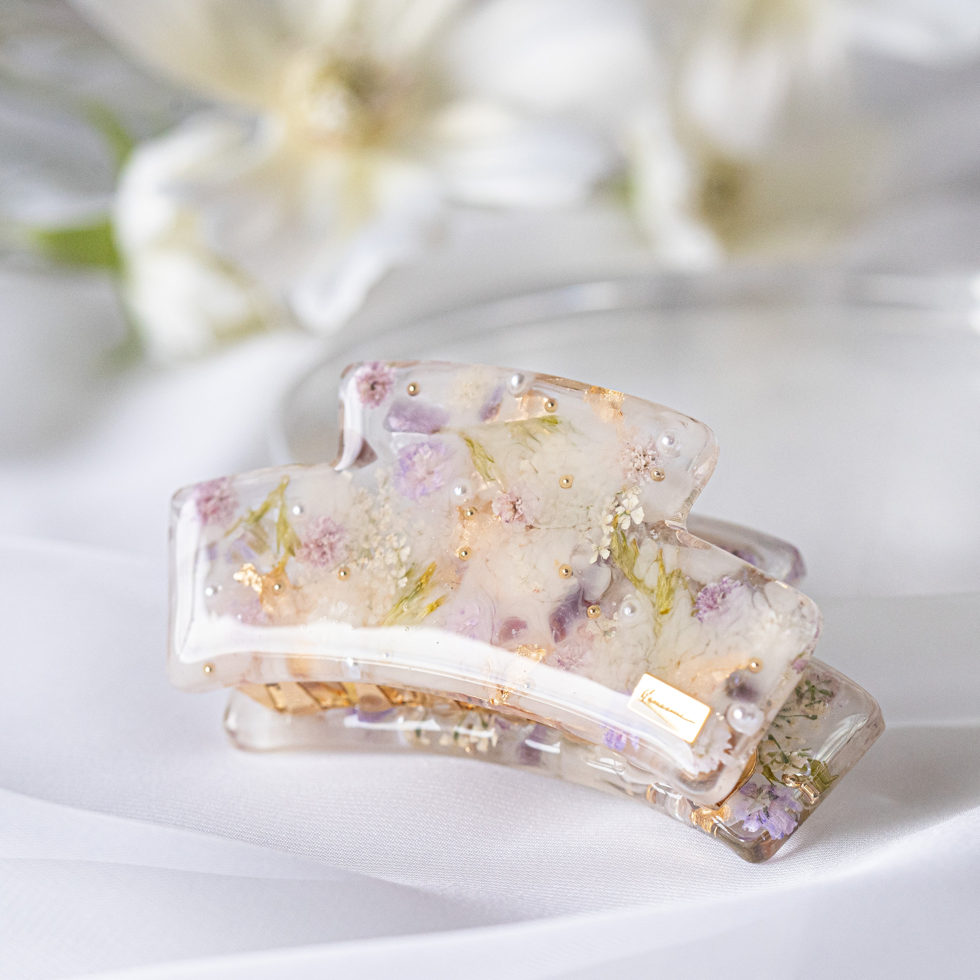 使用するお花や素材は厳選し、淡く繊細なトーンを大切にしています。 自然な肌なじみを考慮し、身につけた瞬間に ホッとするような心地よさを追求。 優しさと温もりを感じる、柔らかい印象を心がけています。